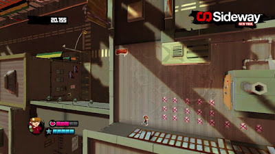 Bom a novidade, diferencia, atrativo sei la como definir isso, enfim em sideway new york o jogo se passa nas paredes da cidade NOX é transformado em pichação e tem que enfrentar inimigos pelas paredes, isso é bem interessante, quando NOX dobra uma esquina ou sobe um telhado a câmera tem que mudar de perspectiva tambem porem isso afeta tanto a posição quanto a gravidade da tela em que NOX se encontra.